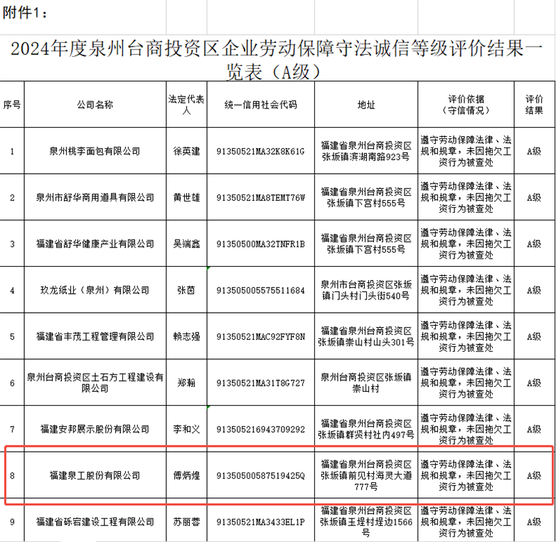 近日,根据《泉州台商投资区管理委员会民生保障局关于开展2024年度企业劳动保障守法诚信等级评价的通知》(泉台管民生文〔2025〕11号)文件规定,经严格审核,福建凯发网站股份有限公司(以下简称“凯发网站股份”)被评定为“2024年度企业劳动保障守法诚信等级A级企业”,成为全区25家获此殊荣的企业之一。